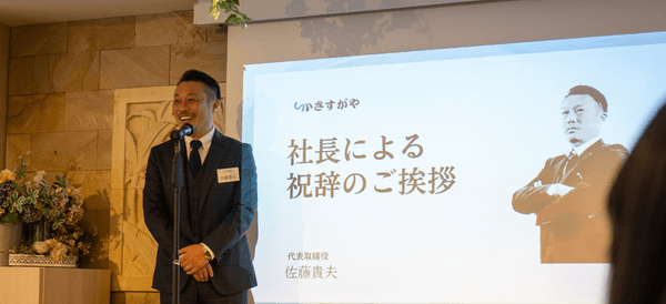内定式での祝辞の中で、株式会社さすがやの佐藤貴夫代表取締役社長は、内定者に向けて次のように語りました。「さすがやで働くことを、自分自身を豊かにするための手段として活用してほしい。」「旅行や趣味など、やりたいことが見つかったら、迷わずに遠回りせず、まず挑戦してほしい。残りの学生生活の時間を活かし、多くの経験を積んでください」と、会社の存在意義、行動の質の大切さについてメッセージを送りました。