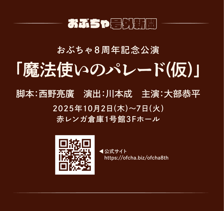 おぶちゃ企画・製作、おぶちゃ8周年記念公演『魔法使いのパレード(仮題)』が2025年10月2日(木)〜10月7日(火)に横浜赤レンガ倉庫 1号館3Fホール(神奈川県横浜市中区新港1丁目1−1)にて上演されます。