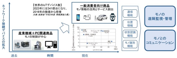 IoTの概念は、もともと産業用機械の領域で、M2M(Machine to Machine)と呼ばれ、主にモノ(機械)の遠隔制御・管理で活用されていた。ただ近年は、ネットワークの進化や、センサー技術の小型化、低消費電力化、低価格化が進展していることで、対象が産業用機械だけでなく、安価で大量に存在する消費者向け機器へと拡大している。それにより、IoTが担う役割も、モノの制御から、モノが発信するデータの活用へとシフトしている。