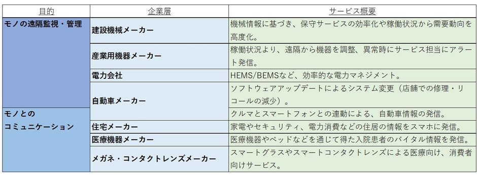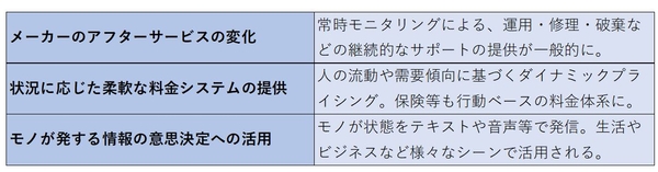 IoTの台頭は、製品に機能が追加されて付加価値が高まると同時に、周辺サービスを手厚くすることができる。また、企業は、モノが発信するリアルタイム情報を活用することか可能になり、迅速で精度の高い意思決定に活用できる新たな情報インプットを獲得できることになる。