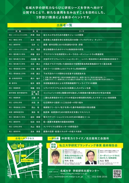 第4回となる本年度は「カーボンニュートラル達成に向けて」をテーマに、5学部から21 件の研究シーズを展示し、「文部科学省私立大学研究ブランディング事業」に採択された「青色LEDを起点とした新規光デバイス開発」および「新規ナノ材料の開拓と創生」による当事業の最終報告会も同時開催します。