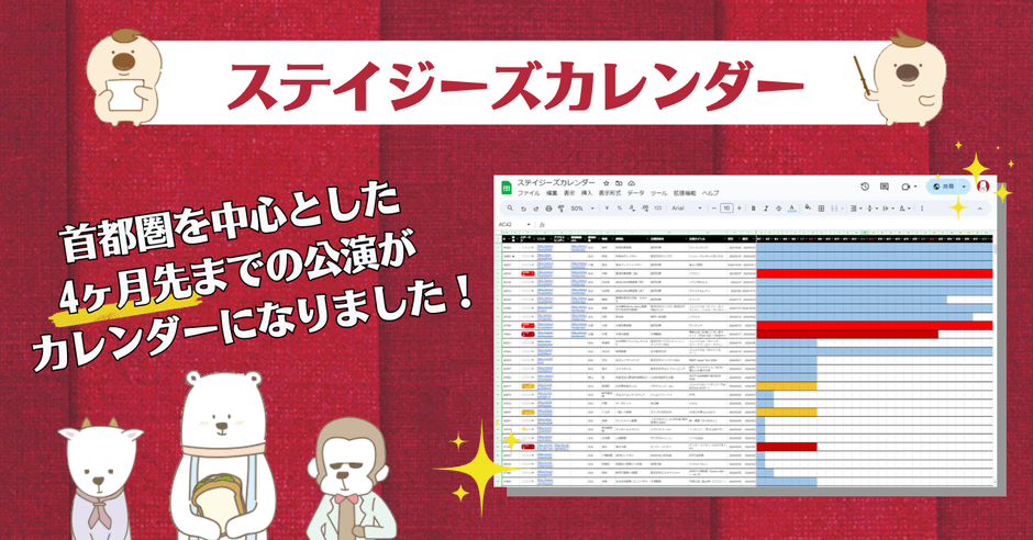 ステイジーズのWEBコンテンツとして、向こう4か月の公演情報がひとつにまとまったGoogleスプレッドシート「ステイジーズカレンダー」もご活用ください。首都圏を中心に約1000公演が一覧で見られるほか、Excelファイルでダウンロードすることで、ご自身の用途・お好みに合わせ、項目の並び替え・追加・削除などカスタマイズが可能です。「今どこで、どんな公演が上演されているんだろう?」「今度のお休みに何が観られそうかな?」といった皆さまのお悩みに寄り添います。観劇スケジュールを立てる際や、見落としている公演がないかのチェックなどにも、ぜひお使いください!