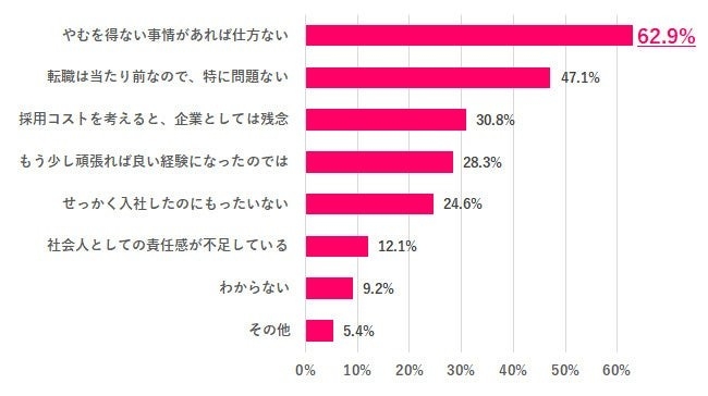 新卒が入社後1年以内に退職したことについて、どう思ったか聞いたところ、1位「やむを得ない事情があれば仕方ない」62.9%、2位「転職は当たり前なので、特に問題ない」47.1%でした。