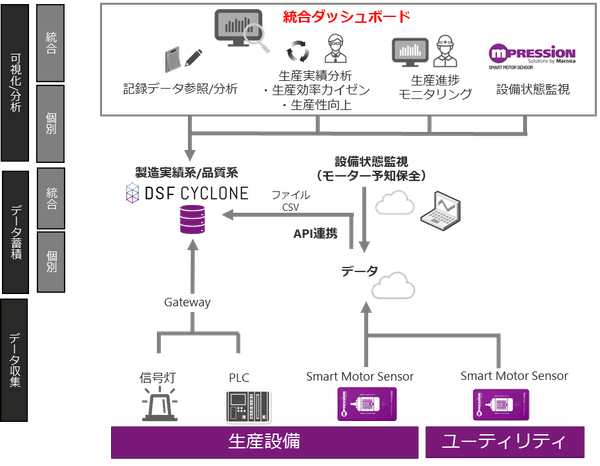 そこでこのたび、このような現場課題及び将来のビジョンに向けて、生産状況及び生産効率の可視化、故障予知に特化したSMSデータなどを一元管理する統合型ダッシュボードが実現できる「DSF Cyclone」を組み合わせたマクニカオリジナル総合ソリューションの導入を決めました。