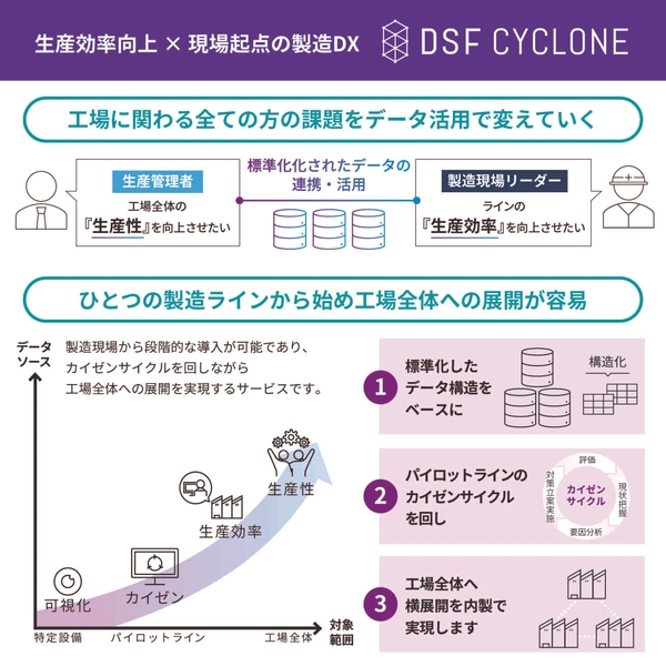 DSF Cycloneは製造現場と生産管理を実績データでつなぎ工場の生産効率と生産性の最適化を図る製造実績システムです。データドリブンな工場運営の意思決定が可能となります。データ収集、正規化、利活用が1パッケージになっており工場全体に展開しやすい機能を備えています。DSF Cycloneはマクニカで開発し、多種多様な製造工程へ導入しております。導入いただいた製造現場では、日々の実績データを元に効率的なものづくりを実現しています。