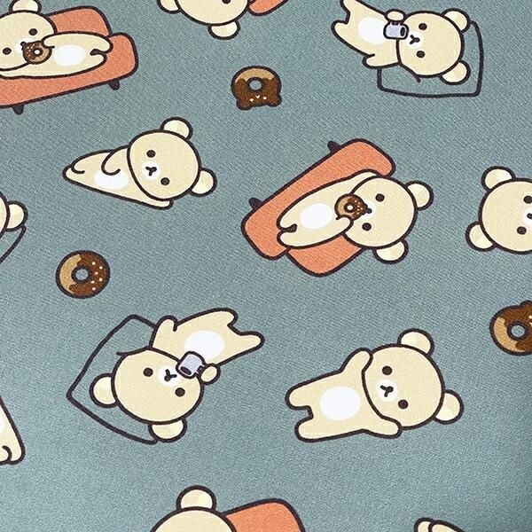 フロアクッション一面にはリラックマが大量にデザインされています。ゴロンとくつろいだり、ドーナッツを食べたりと癒しの姿に見てほっこりします。