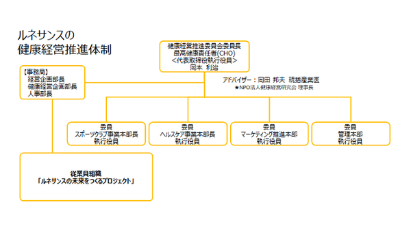 当社では、代表取締役社長執行役員の岡本利治が最高健康責任者(CHO:Chief Health Officer)として「ルネサンス健康経営宣言」※1を掲げ、従業員が積極的に健康づくりに取り組めるための支援と、働きがいを持って仕事に取り組める組織づくりを継続的に推進しております。また、2022年10月より、経営トップと各事業や機能部門の役員を中心とした「健康経営推進委員会」に「ルネサンスの未来をつくるプロジェクト」※2を加え、各事業や機能部門が主体的に健康経営に関与、連携を図り、実行力をあげるための体制づくりを行っています。