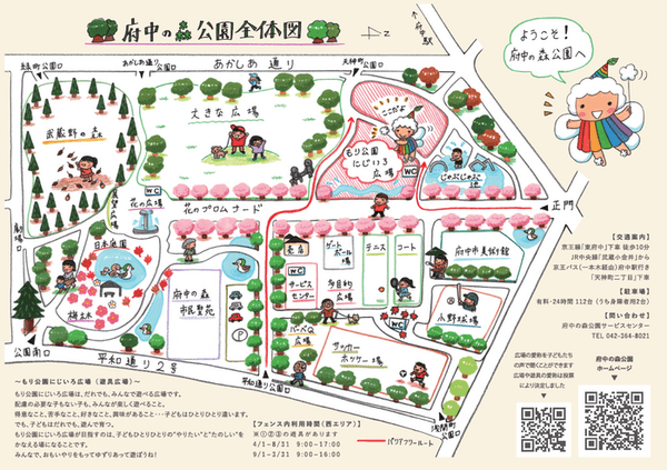 園内には、300mの桜並木「花のプロムナード」をはじめ、ジョギングコース、野球、テニス、サッカーなどの充実したスポーツ施設や、遊具広場や水辺の広場などがあります。また、著名作家による彫刻が11体配置されているほか、園内の府中市美術館、近隣に府中の森芸術劇場があり、いこいの場所としてだけでなく、スポーツ、文化施設を楽しむことができます。