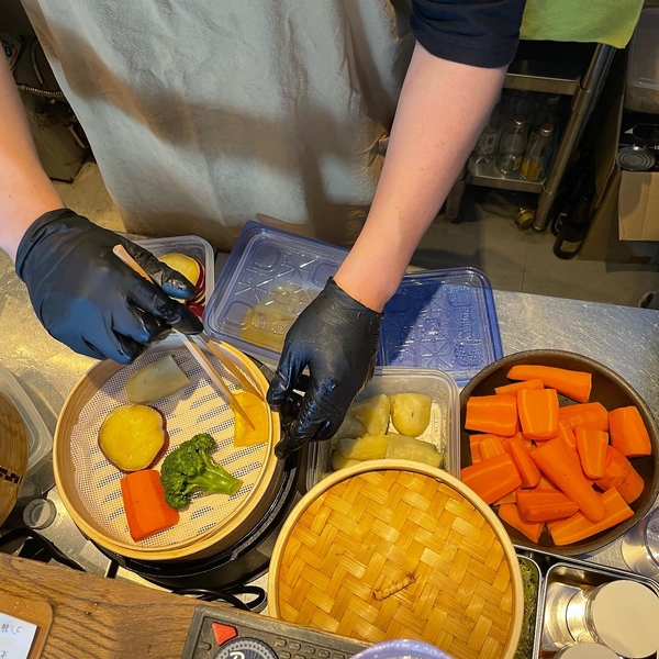 せいろで蒸し立ての大きめ野菜をトッピング。甘味もあって美味いホクホクの産直野菜は店主が鹿児島指宿で感銘を受けた蒸し野菜スタイルです。