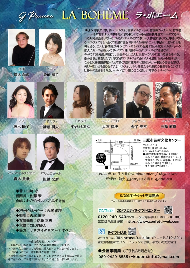 YKOPERA企画主催『プッチーニ作曲オペラ「ラ・ボエーム」全4幕字幕付き原語上演』が2022年12月8日(木)に三鷹市芸術文化センター風のホール(東京都三鷹市)にて上演されます。チケットはカンフェティ(運営:ロングランプランニング株式会社、東京都新宿区、代表取締役:榑松 ⼤剛)にて6月20日(月)より発売開始です。