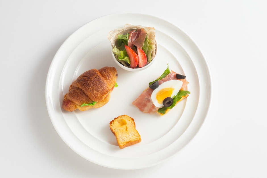 日光そばのミニサラダガレット、フレンチオープンサンド、玉ねぎと3種チーズのケークサレ、クロワッサンサンド