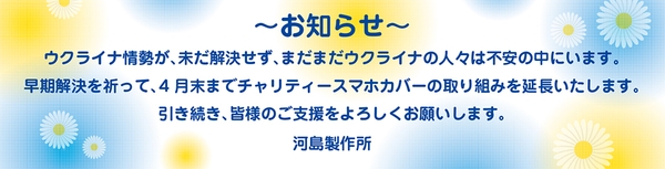~ウクライナに平和の花を咲かせよう~ ウクライナの人々に、1日でも早く平和が訪れますように・・・ 3月から開始したウクライナ人道支援チャリティースマホカバー、3月累計で162ヶのご支援の輪が広がりました。ありがとうございます。一方で、ウクライナ情勢は依然として厳しい状況が続いています。一日でも早く平和が訪れるよう願うとともに支援の輪を4月末まで延長します。発売は河島製作所楽天市場店にて。