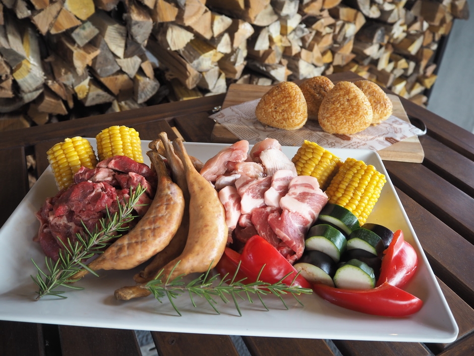 コーン、パプリカ、ズッキーニ、ナス、焼きおにぎり、殻付きホタテ、有頭海老、ヤリイカ、タコ