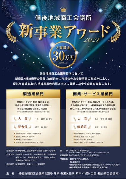 なお、「新事業アワード2021」の表彰式は2月22日(火)に福山ニューキャッスルホテルにて行われる「ビジネス交流フェア」(主催:福山商工会議所)内にて行われます。