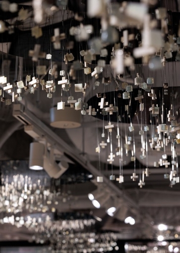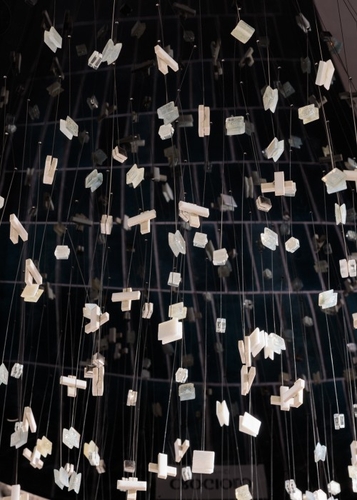 雪が静かに降る瞬間を映した「スノーフレーク」は、奥行きのある空間の中で、光の粒のような輝きを放ち、訪れる人を“道しるべ”のように誘います。グリム童話『ヘンゼルとグレーテル』の白い石に着想を得て生まれた、この静謐なアートワークをどうぞお楽しみください。