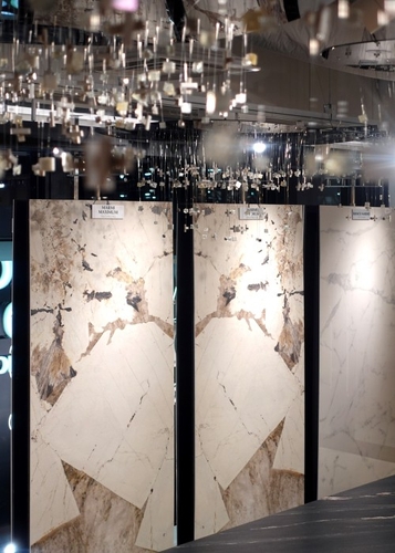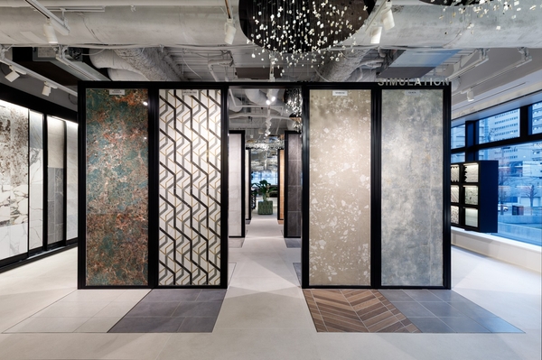 ショールームに入ってすぐの「RING STAGE(リングステージ)」では大判タイルがお出迎えし、さまざまな種類のタイルを浮遊するオブジェのように展示しています。迫力あるスケール感を体感できるとともに、最新技術が生み出すデザインの美しさや質感を堪能していただける空間です。