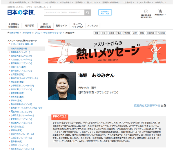 全国の大学・短大・専門学校などの学校情報を提供する、株式会社JSコーポレーション(本社:大阪市北区 代表取締役社長:米田英一)は、アスリートからの熱いメッセージ「サッカー/海堀あゆみさん(https://school.js88.com/scl_h/onepoint-advice/sport?item=2&athlete=232 )」を公開しました。