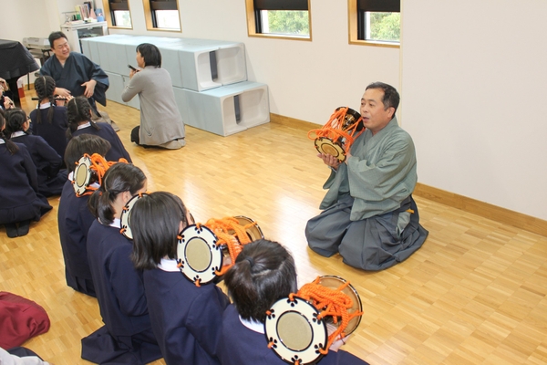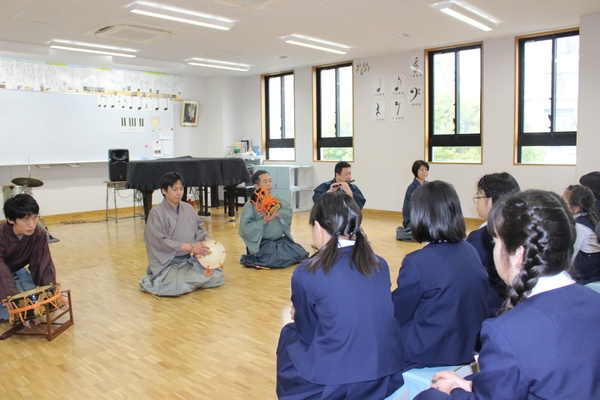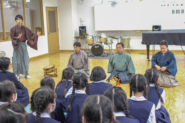 山本能楽堂の能楽師の方々による模範演奏や舞の披露を間近で鑑賞します。700年以上の歴史を持つ「能」の所作や表現技法について、わかりやすい解説とともに紹介され、児童は日本の伝統芸能の美しさと深さを直接体感できます。 - 伝統楽器の実技体験