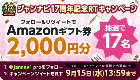 ジャンナビ公式twitterの対象ツイートに引用リツイートしてくれた方の中から抽選で、Amazonギフト券2000円分を17名様にプレゼント!(YouTubeチャンネル登録で当選率アップ!)