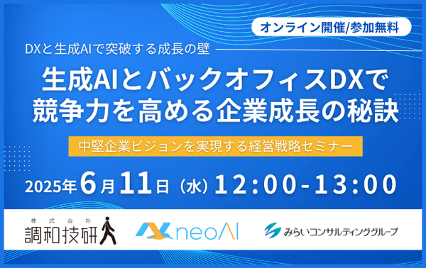 みらいコンサルティンググループ(本社:東京都中央区、代表:久保 光雄 岡⽥ 烈司)は、2025年6月11日にセミナー『生成AIとバックオフィスDXで競争力を高める企業成長の秘訣』をWEBにて開催します。