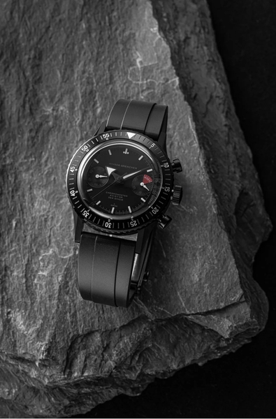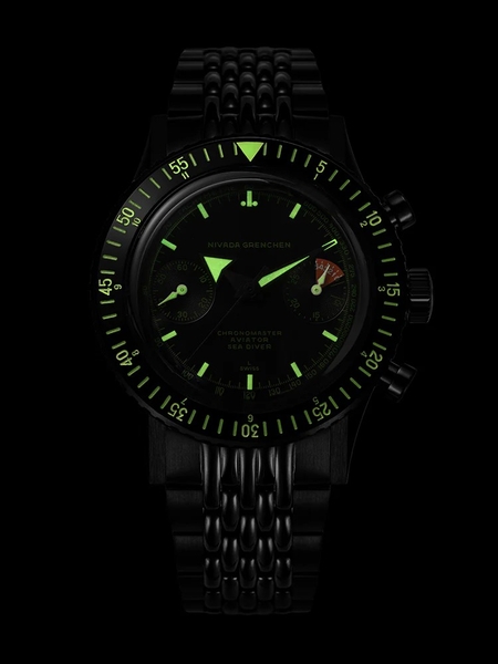 光沢のあるブラックDLCコーティングを施したケースに、マットブラックのダイヤルを組み合わせ、ホワイトのルミノバインデックスが優れた視認性を確保。さらに、3時位置には鮮やかなレッドの「ヨットカウンター」機能を搭載し、Nivadaの探検精神を象徴する大胆なアクセントとなっている。