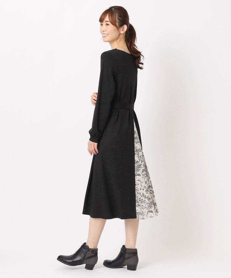 背中の切り替えからさりげなくのぞくロイド柄のワンピース。滑らかなポンチ素材を使用しているので、しわになりにくく着心地抜群です。