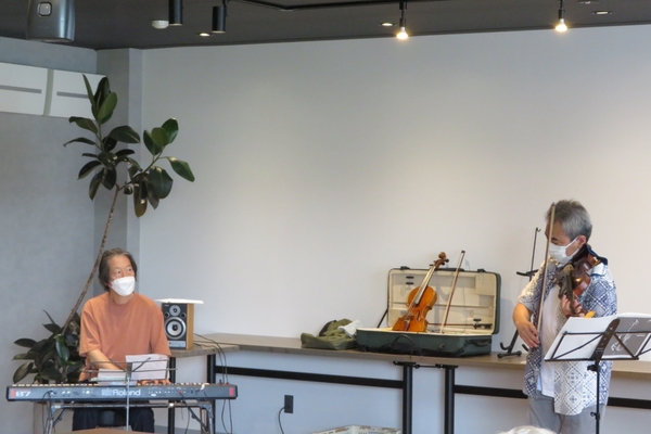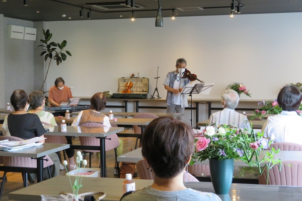 8月6日(土)に初開催された「土曜11時の音楽会」では、バイオリン奏者の鞍田玄氏をゲストにお迎えし、花まつフラワーアカデミーの生徒ら25名が参加。「夏の思い出」や「愛の挨拶(エルガー作曲)」など全7曲の生演奏にひたりました。