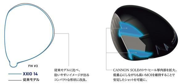 「ゼクシオ 14」、「ゼクシオ 14+」フェアウェイウッドは、低重心化と高初速化を両立した「New CANNON SOLE」(ニューキャノンソール)と、高初速化を実現した「Edge Cup Face」を搭載。さらに高く、遠くへ、爽快に飛ばすフェアウェイウッドとなっています。