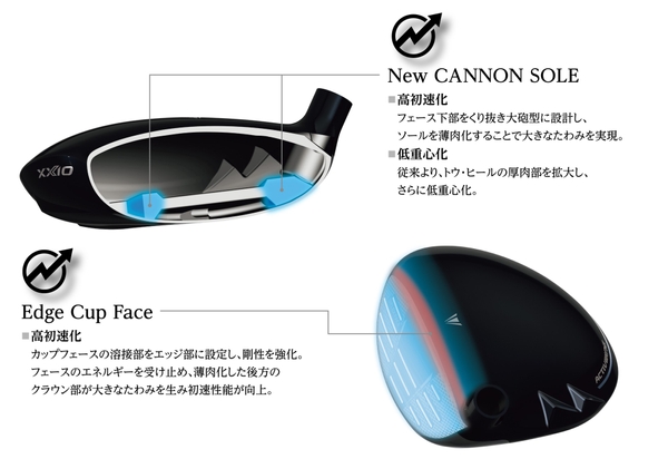 ソール内のフェース側付近下部をくり抜き大砲型に設計し、ソールを薄肉化すると共に、トウ・ヒールの厚肉部を拡大し、重心をさらに低く設計した「New CANNON SOLE」を搭載。低重心化と高初速化を両立しました。さらに、カップフェースの溶接部をエッジ部に設定した「Edge Cup Face」がフェースだけでなくボディのたわみを増大し、初速性能が向上しました。