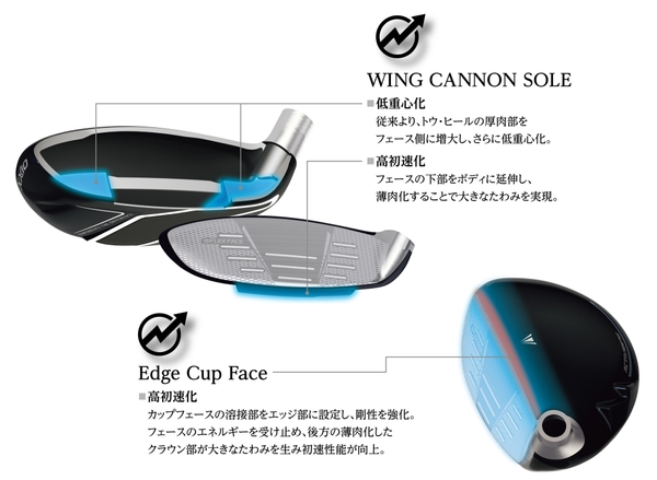 従来モデルに比べ、トウ・ヒールの厚肉部をフェース側に広げ、重心をさらに低く設計すると共に、フェース下部をボディ側に延伸し、薄肉化することでフェースを大きくたわませ、低重心化と高初速化を実現した「WING CANNON SOLE」を搭載。さらに、カップフェースの溶接部をエッジ部に設定した「Edge Cup Face」がフェースだけでなくボディのたわみを増大し、初速性能が向上しました。