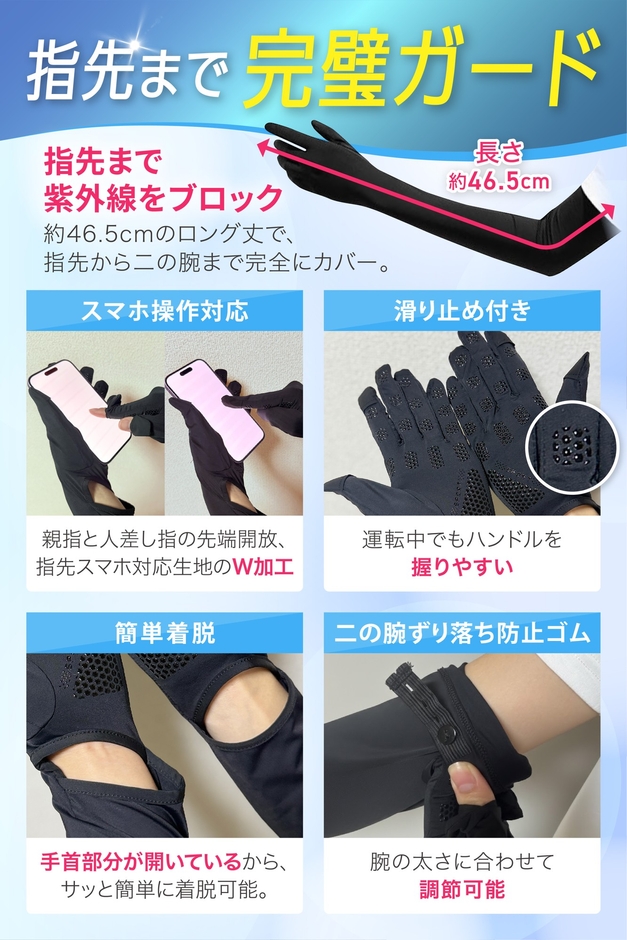 最長約56cmのロング丈で、無防備になりがちな指先から二の腕までを完全カバー。