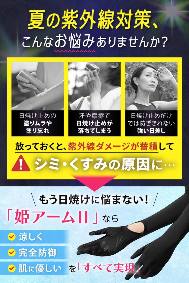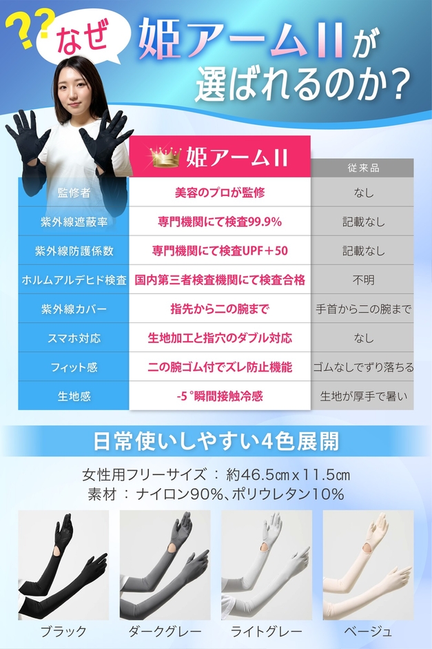 美容のプロ2名が監修した、紫外線から“姫肌”を守る 進化版スマホ対応 真夏も快適なUVカット アームカバー「姫アームⅡ」。2026年 4月amazon.co.jpより販売スタート