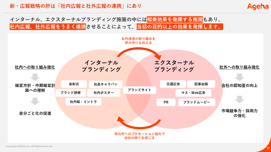 そこで、各ステークホルダーに向けた取り組みの連携、つまり、社内広報と社外広報の連携が重要となります。インターナルブランディング(インナーブランディング)、エクスターナルブランディング(アウターブランディング)施策の中には相乗効果を発揮する施策もあり、うまく連携させることによって、当初の目的以上の効果を発揮します。この考えを「新・広報戦略」としてご説明しました。