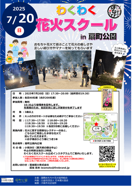 国際おもちゃ花火協同組合と公益社団法人日本煙火協会は、2025年7月20日(日)に大阪市北区・扇町公園にて、親子で参加できる無料の体験イベント『わくわく花火スクール in 扇町公園』を開催いたします。