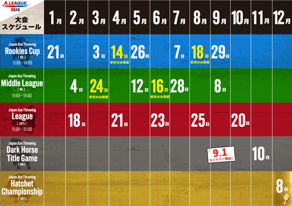 当大会では、2024年1月1日から11月10日の予選期間で、12月8日に東京で開催する最終大会(本戦)に出場する15名を選出します。選出方法は、まず、1月1日から10月20日の期間での累積サーキットポイント(*2)上位12名を選出します。(*3) それに加えて、11月10日に東京、愛知、大阪で開催する < Japan Axe Throwing Dark Horse Title Game 2024 〜ダークホースになれ。〜> の各開催地上位1名の合計3名を選出し、最終大会(本戦)出場者15名を決定します。
