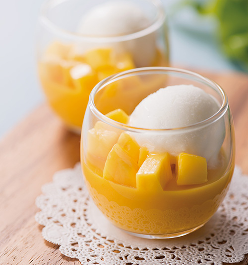 「マンゴープリン ジンジャー風味のベルガモットソルベ添え」