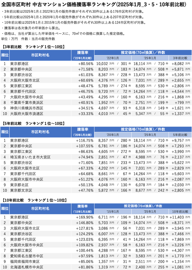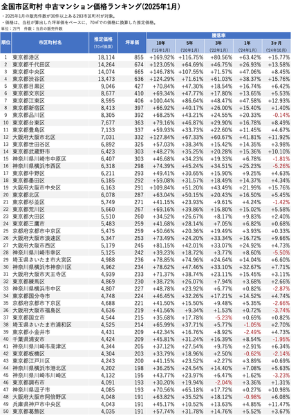 全国市区町村 中古マンション騰落率ランキング(2025年1月_3・5・10年前比較)