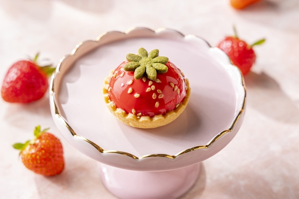 抹茶とホワイトチョコレートのガナッシュにストロベリームースを重ね、ホワイトチョコレートのグラサージュで艶やかに仕上げたタルト。白ごまを散らして苺の種を、抹茶のクッキーでヘタを表現しました。まるで苺のような可憐なビジュアルもお楽しみください。