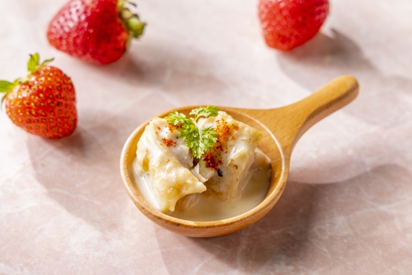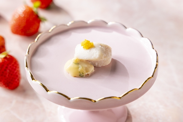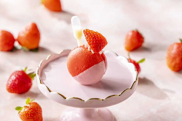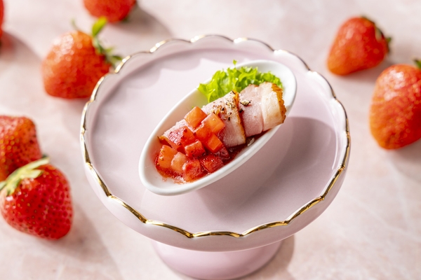 苺ピューレに赤ワインビネガーとオリーブオイルを合わせた芳醇な自家製のソースで味わう、スモークダック。セイボリーにも苺の魅力を感じていただけるよう味わいと香りのバランスにこだわりました。