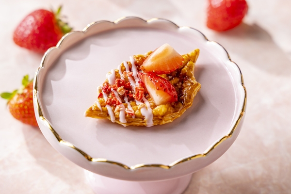 キャラメリゼしたリーフ型のパイに苺とストロベリーチョコレートをあしらい、苺の甘酸っぱさをプラスしました。サクサクとした軽やかな食感と香ばしいキャラメルの香りが心地よく広がります。