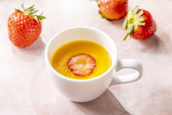 にんじんと玉ねぎをじっくりと炒めて甘みを引き出し、ブイヨンとミルクで仕上げました。スライスした苺を添え、やさしい甘さの中にほのかな酸味が香る上品な味わいに。