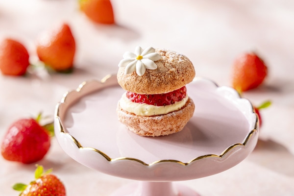 苺クリームをサンドしたマカロンにスポイト入りの練乳を添えました。お好みで練乳を加えることで、苺の酸味とまろやかな甘さが溶け合い、まるで苺ミルクのような味わいに。
