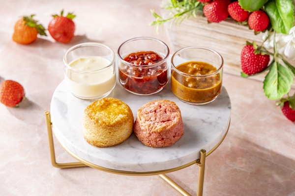 定番のプレーンに加え、北海道産クリームチーズを練り込んだ苺のスコーンをご用意しました。なめらかなクロテッドクリーム、苺とバルサミコ酢を合わせた芳醇なジャム、シャキシャキのりんごと濃厚なキャラメルのクリームを添えて、お好みの組み合わせでお楽しみください。