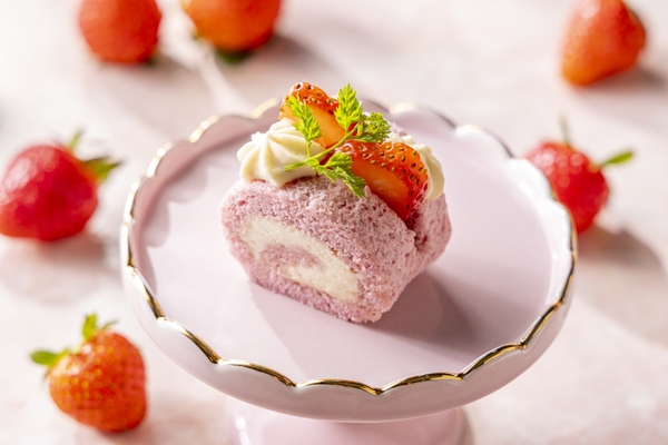 ダージリンとホワイトチョコレートのクリームを苺のスポンジ生地でふんわりと巻き上げたロールケーキ。苺の酸味、ホワイトチョコレートのまろやかな甘さ、そして芳醇な紅茶の香りがひと口ごとに広がります。