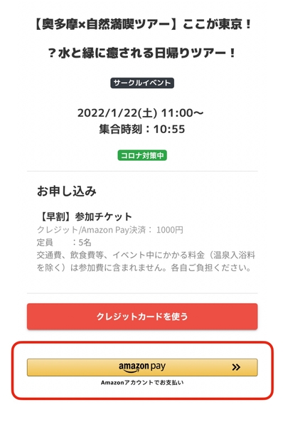 手順1 つなげーと上で、イベントの事前決済が求められている場合には「クレジットカード決済」および「Amazon Pay決済」のいずれかの決済方法から選んでいただけます。