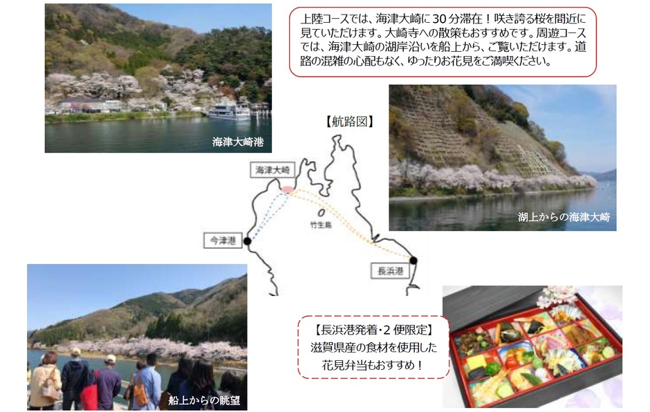 本クルーズでは、船上でゆったりとお花見をご満喫いただけるよう、周遊のみのコースや海津大崎を散策できるコース、お弁当付きのコースなど、多彩なプランをご用意しております。