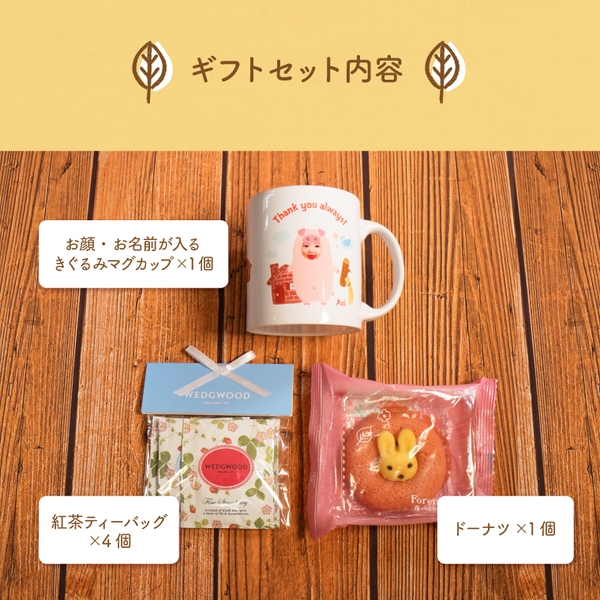 つぶらな瞳がほっこりとした気持ちにしてくれるかわいい動物の焼ドーナツと、ウエッジウッドのティーバッグセットをお付けいたします。