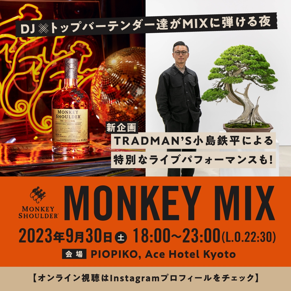 『100% MALT WHISKY MADE FOR MIXING』がコンセプトのモンキーショルダーは、9月30日(土)18時から、エースホテル京都 2 階にある PIOPIKO バー&タコスラウンジにて、DJ の音楽とトップバーテンダーのカクテルが響き合うライブイベント『MONKEY MIX』を開催します。