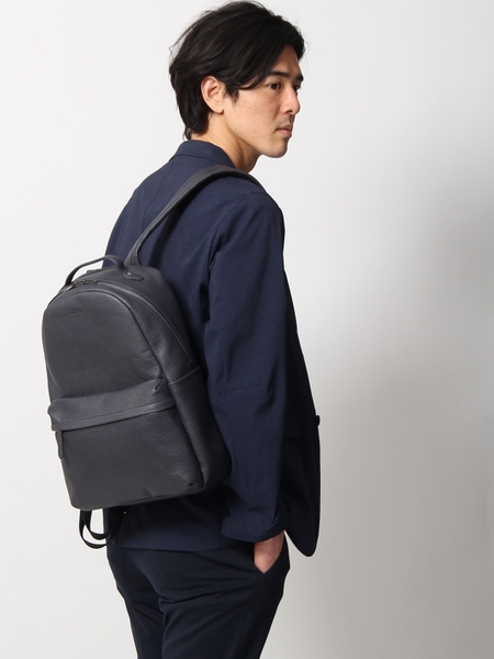 革本来の質感とこだわりのデザインで高い人気を誇る革製品ブランド『SEEKER(シーカー)』に別注し、梅雨時期に安心して使用できる防水仕様のレザービジネスバックパックを企画しました。一般的な防水加工は、革を生地にした後に表面をコーティングするのに対して、今回のバッグは、生地にする前の段階で防水剤を革の繊維の奥まで浸透させるこだわりの製法です。これは、革本来の質感を生かしながら、表面だけではなく生地全体に長期間にわたり防水効果を発揮します。また、革の表面にシボ(シワ)加工を施した「シュリンクレザー」を採用し、上品で柔らかな風合いに加えて独特なシボにより傷が目立ちにくく、ビジネスシーンに最適です。