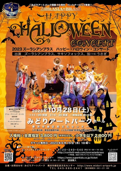 みどりアートパーク主催、みどりアートパーク開館10周年『ズーラシアンブラス ハッピー・ハロウィン・コンサート』が2023年10月28日 (土)に横浜市緑区民文化センター みどりアートパーク(神奈川県横浜市緑区長津田二丁目1番3号)において開催されます。